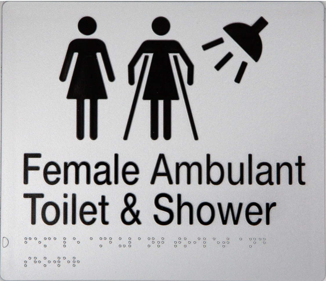 Female Ambulant Toilet & Shower Balck on Silver Braille Sign 210mm X 180mm